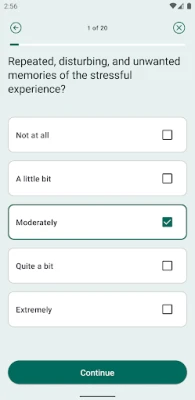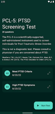 This app is designed to evaluate your symptoms of PTSD with a scientifically-supported 20-question screening test. It uses the PTSD Checklist for DSM-5 (PCL-5), a screening questionnaire for PTSD that is often used in healthcare and research settings. The PCL-5 is also helpful for monitoring your PTSD-related symptoms during and after treatment.