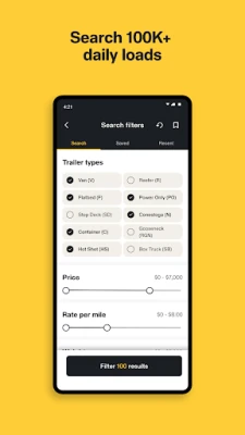 - Filter faster: Search loads by rpm, trailer type, location, broker, and more